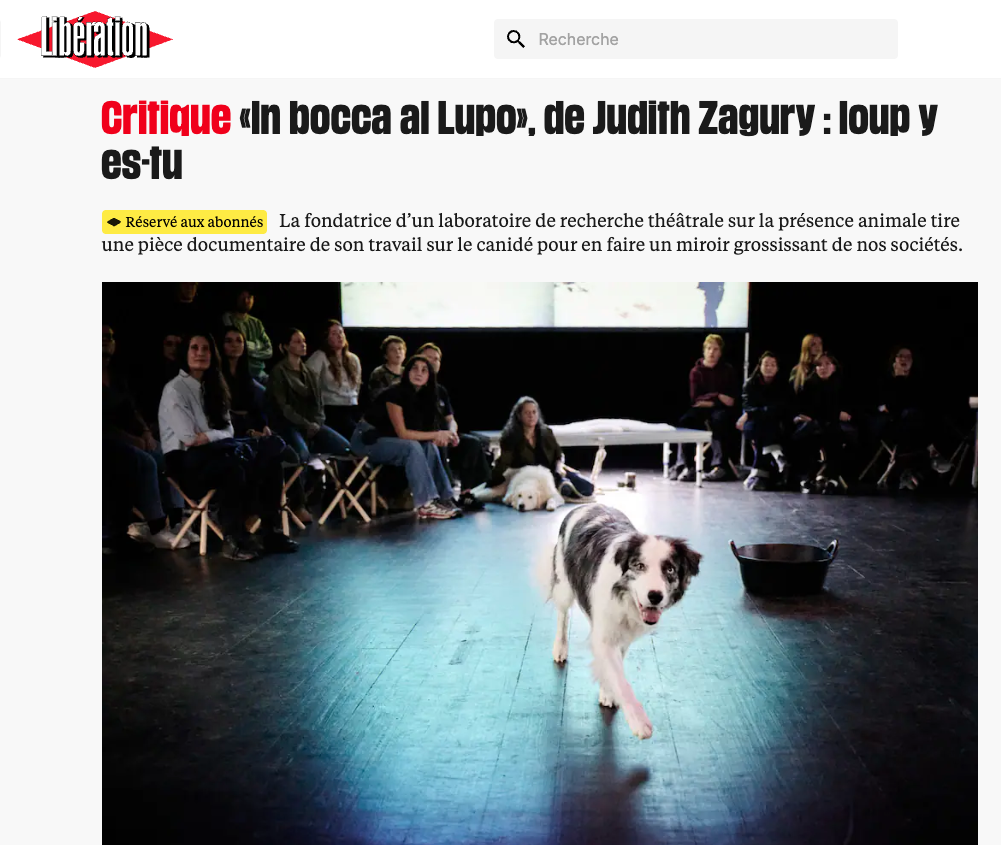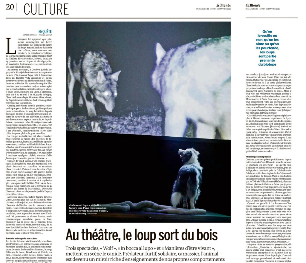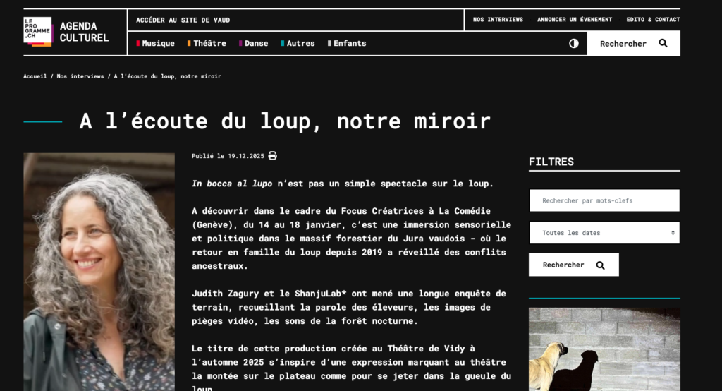 In bocca al Lupo – Revue de presse France inter – Un bol de nature, 8 février 2026 France inter – CO2 mon amour, 8 février 2026 Le Monde, 10 janvier 2026 France 3, 22 décembre 2025 Libération, 24-25 décembre 2025 Programme.ch, 19 décembre 2025 Libération, 9 novembre 2025 RTS – 19h30, 10 novembre 2025 RTS culture, 10 novembre 2025 24 heures, 7 novembre 2025 Le Temps, 6 novembre 2025 RTS – Vertigo, 5 novembre 2025 La Côte, 4 novembre 2025 Culturieuse, 2 novembre 2025 RTS – RamDam, 11 septembre 2025 Le Temps, 3 juin 2025 24 heures, 3 juin 2025